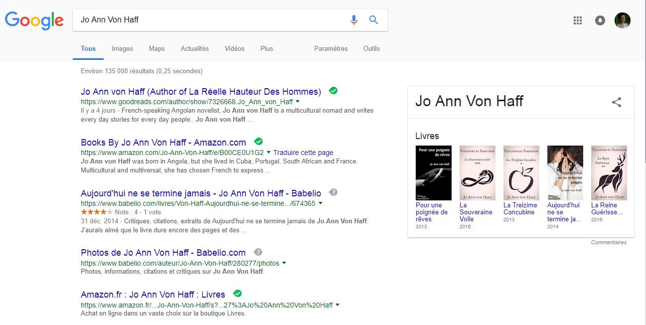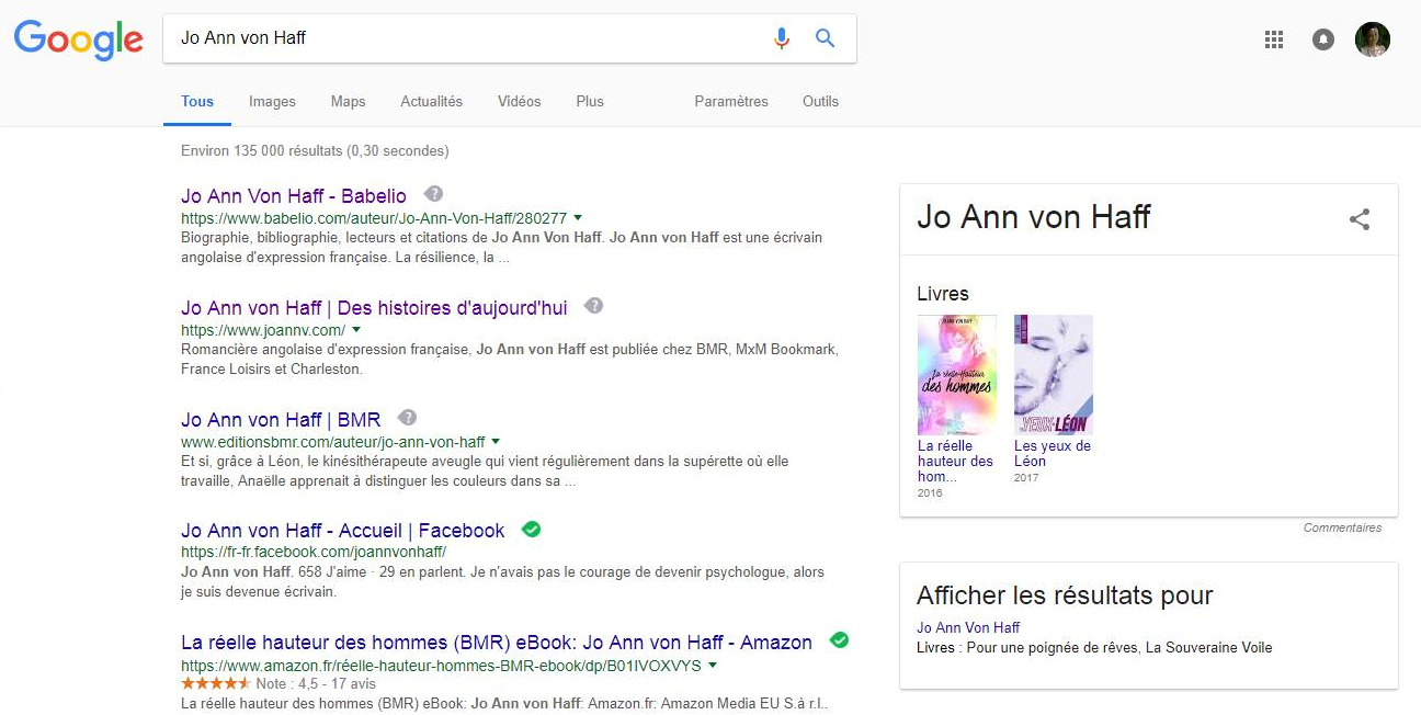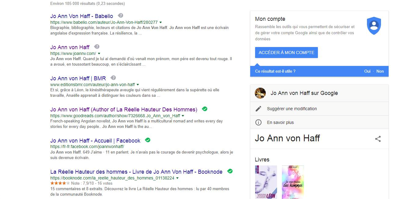 En juillet, je me suis googlée pour m’assurer que mon site était au moins dans la première page de recherches de Google. C’est bien beau d’avoir un site, mais si personne ne le voit quand on fait une recherche sur nous, à quoi bon, n’est-ce pas ?